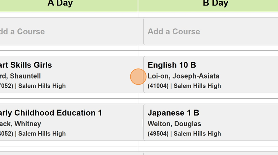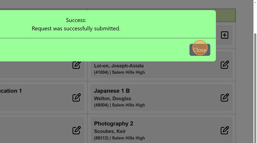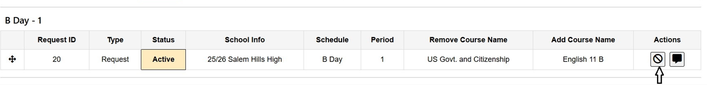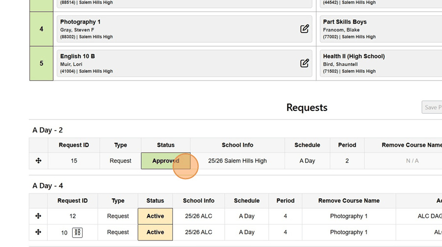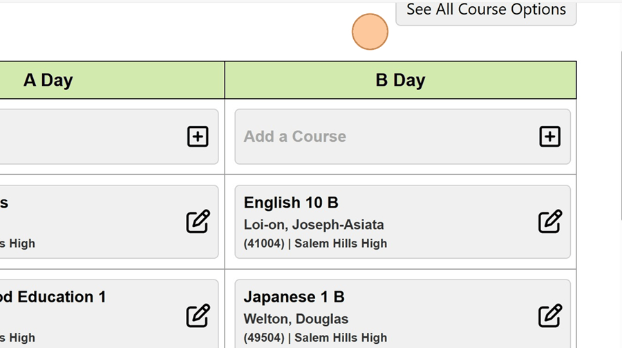 To make a change to a student's schedule, select the edit schedule button next to each course, as shown below: