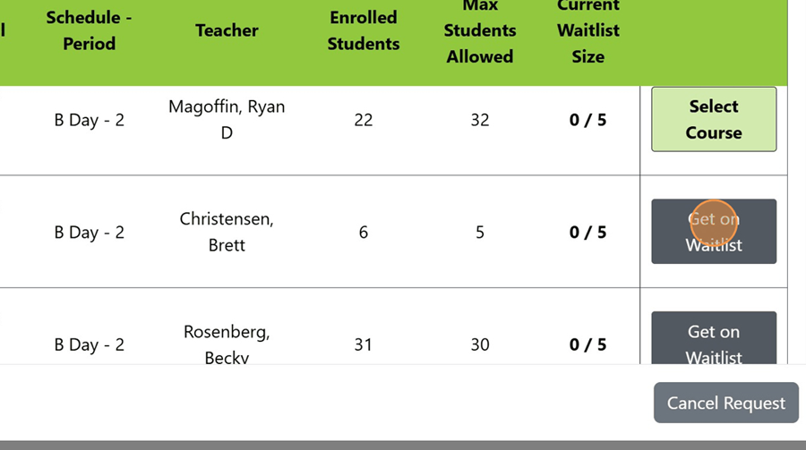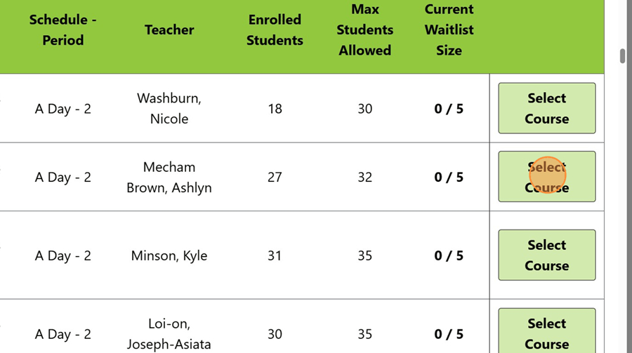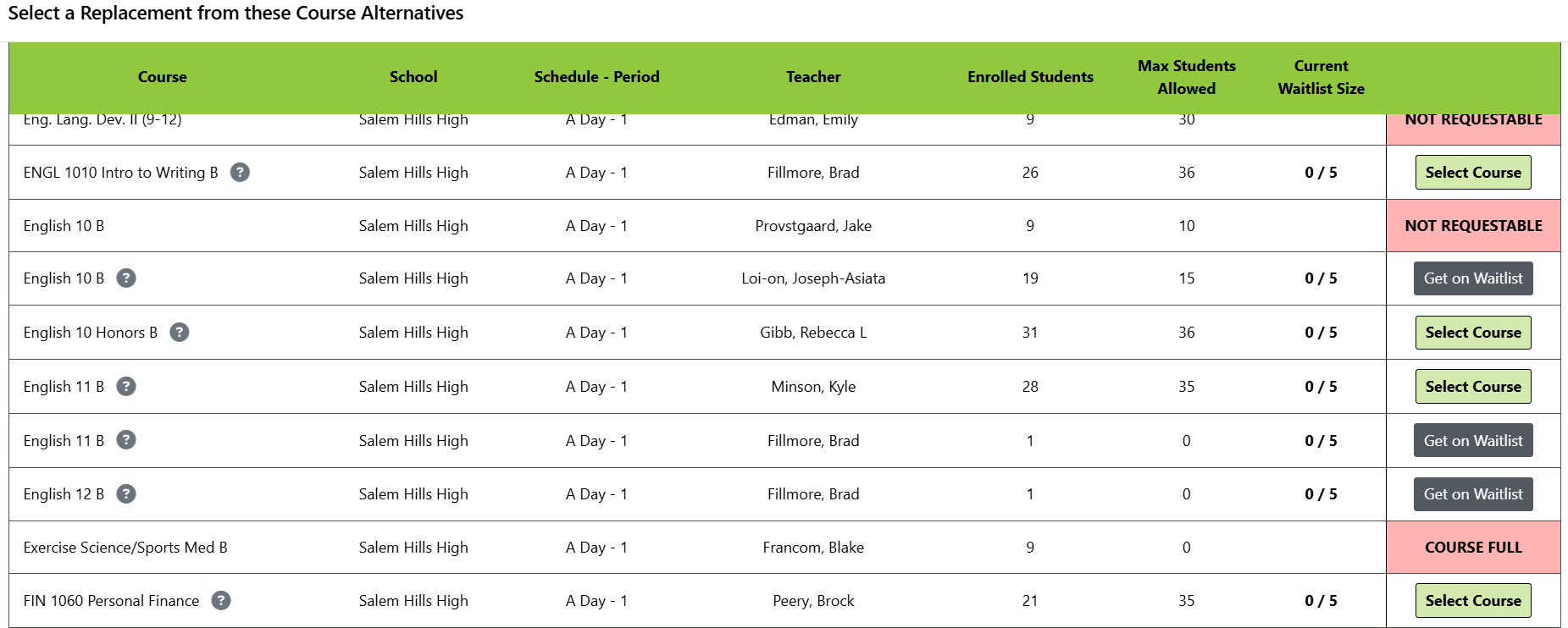 To select a course as a replacement for a course (the name of the course is visible at the top of the screen), select the "Select Course" button to the right of the course you would like to switch into. Courses that are full may have a "Get on Waitlist" option. Depending on how the course that is being removed is scheduled, a student may be required to select more than one replacement course during a single request.