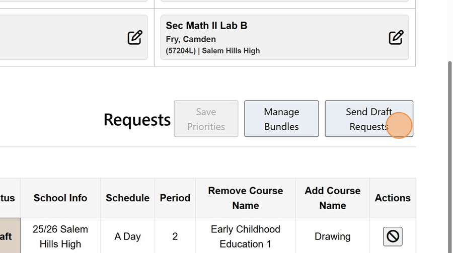 Selecting the Send Draft Requests button will convert ALL draft requests into active requests to be viewable to the counselor.