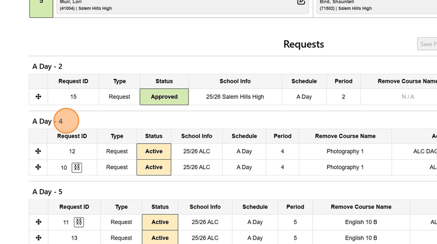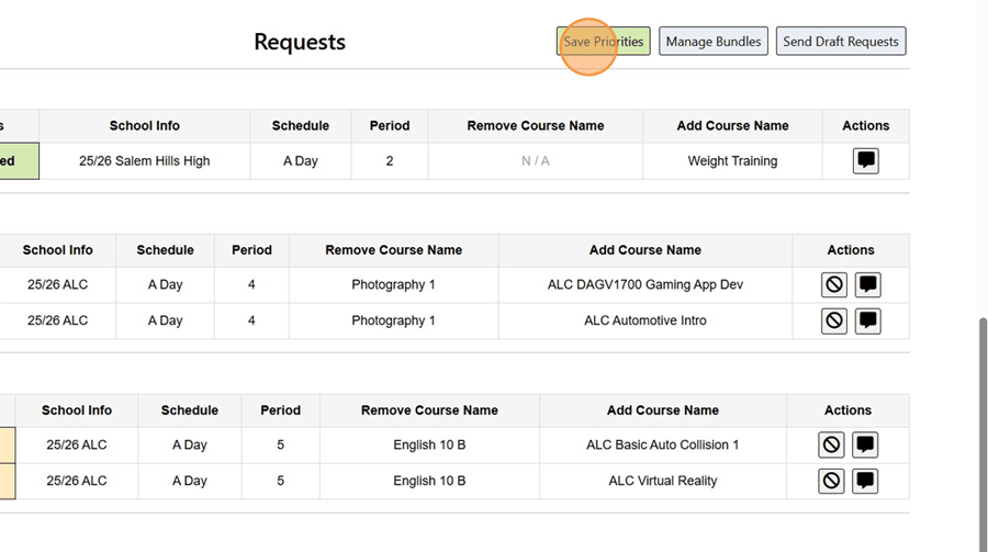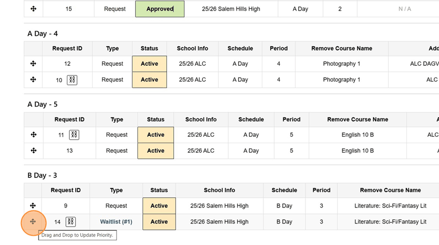 Use the icon in the first column to Drag and Drop requests to the top or bottom within a certain period. Once a request has been placed in a new priority, the "Save Priorities" button becomes live and should be clicked to save the priorities.