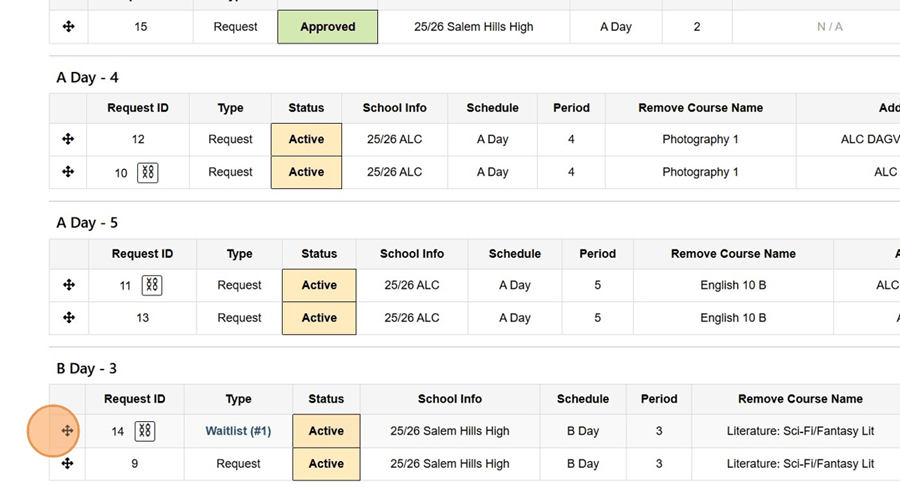 You are now allowed to create multiple requests per period in your schedule. Because of this, you may prioritize the requests in your queue by dragging and dropping the class you want the most to the top.