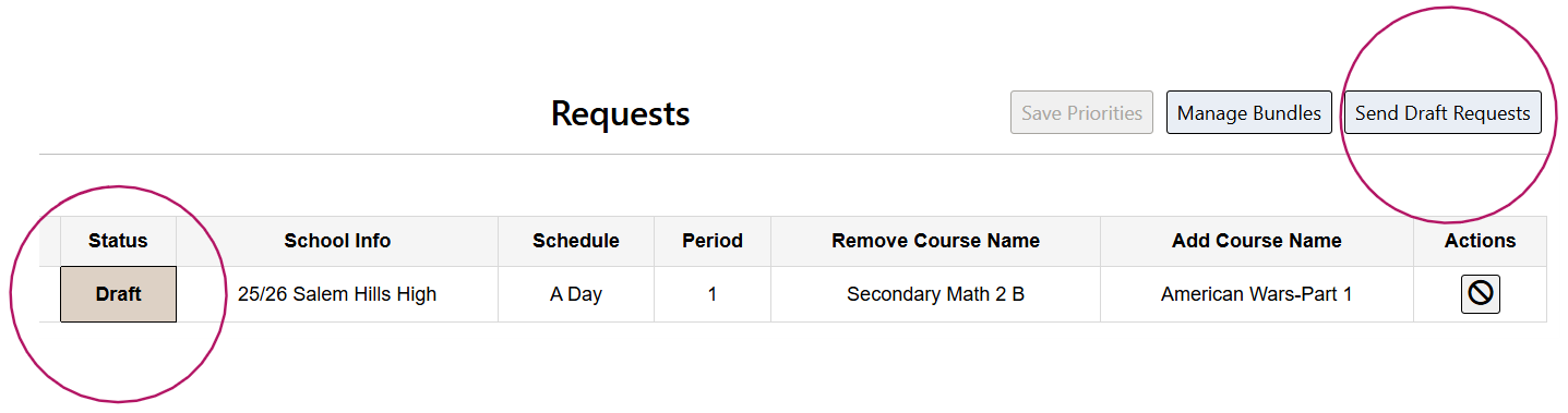 When you select a replacement, the request will go into a "Draft" state as shown below. The reason that requests go into a draft state first is so that you have time to create bundles for these requests before being sent to the counselor to process.