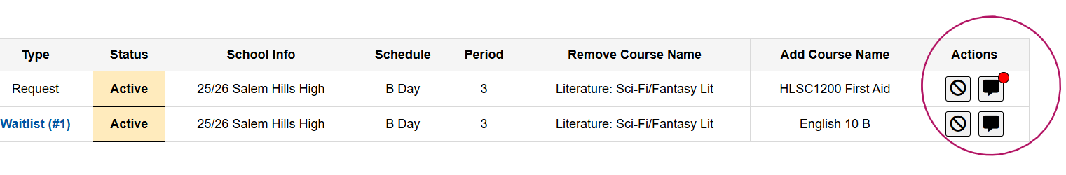 Please Note: If a counselor has left notes on a request, a note bubble will appear next to the comments button.